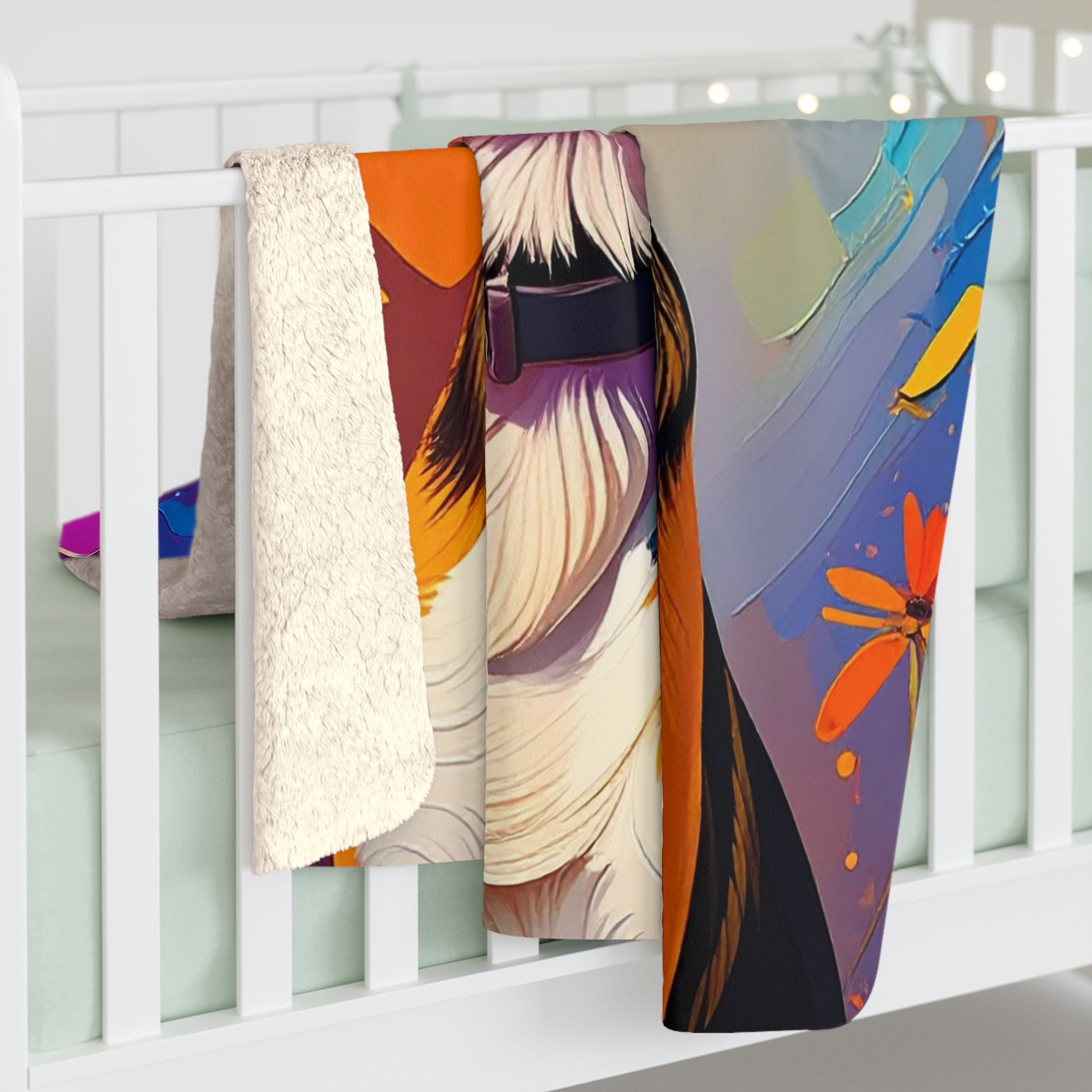 Wrap yourself in warmth and comfort with this cozy Sherpa fleece blanket. Featuring a rich, vibrant design that adds personality to any space, this blanket is perfect for snuggling up on chilly nights. Whether you’re binge-watching your favorite shows or curling up with a good book, its plush texture creates a soothing atmosphere. Ideal for dog lovers, it makes a thoughtful gift for birthdays, housewarmings, or special occasions like Christmas and pet adoption days. Bring style and comfort to your living room or bedroom with this versatile addition that fits seamlessly into any decor. Treat yourself or someone special to the luxurious softness of this blanket!