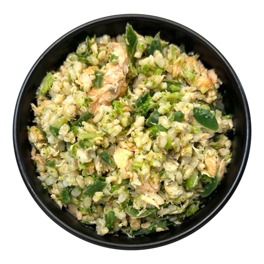 6 Sensational Salmon, 8oz: SALMON, ORGANIC BROWN RICE, GREEN BEANS, BROCCOLI, ORGANIC FLAXSEED OIL